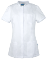Opstaande boord; verdekte drukknoopsluiting; korte mouwen met stretch inzetstukken voor meer bewegingsvrijheid; 1 borstzak; 2 zijzakken binnen met sleutellus, rechts met telefoonzak; zijsplitten